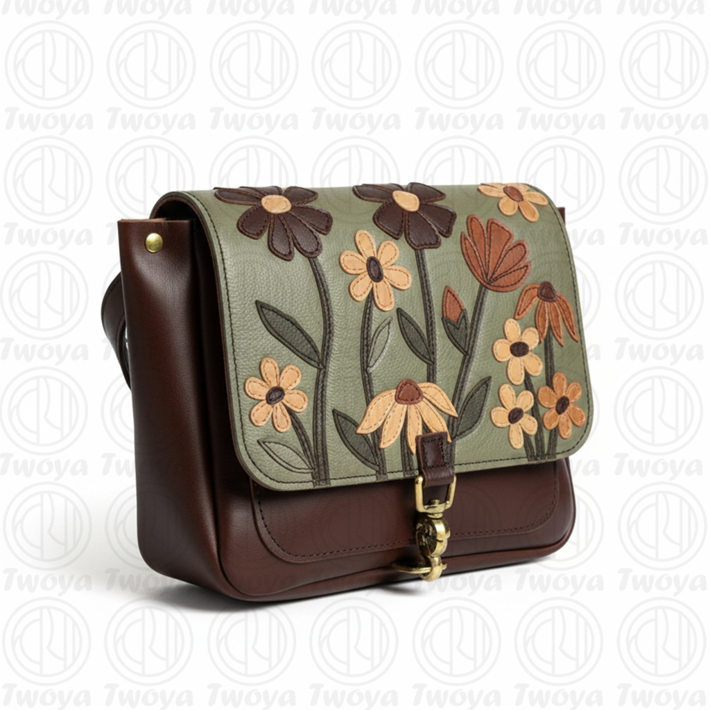 Artisan Floral Appliqué: The front flap features intricate, multi-layered floral appliqués in warm tones of amber, cream, and dark chocolate, beautifully accented with deep green stems. This unique detailing sets it apart from ordinary bags!.