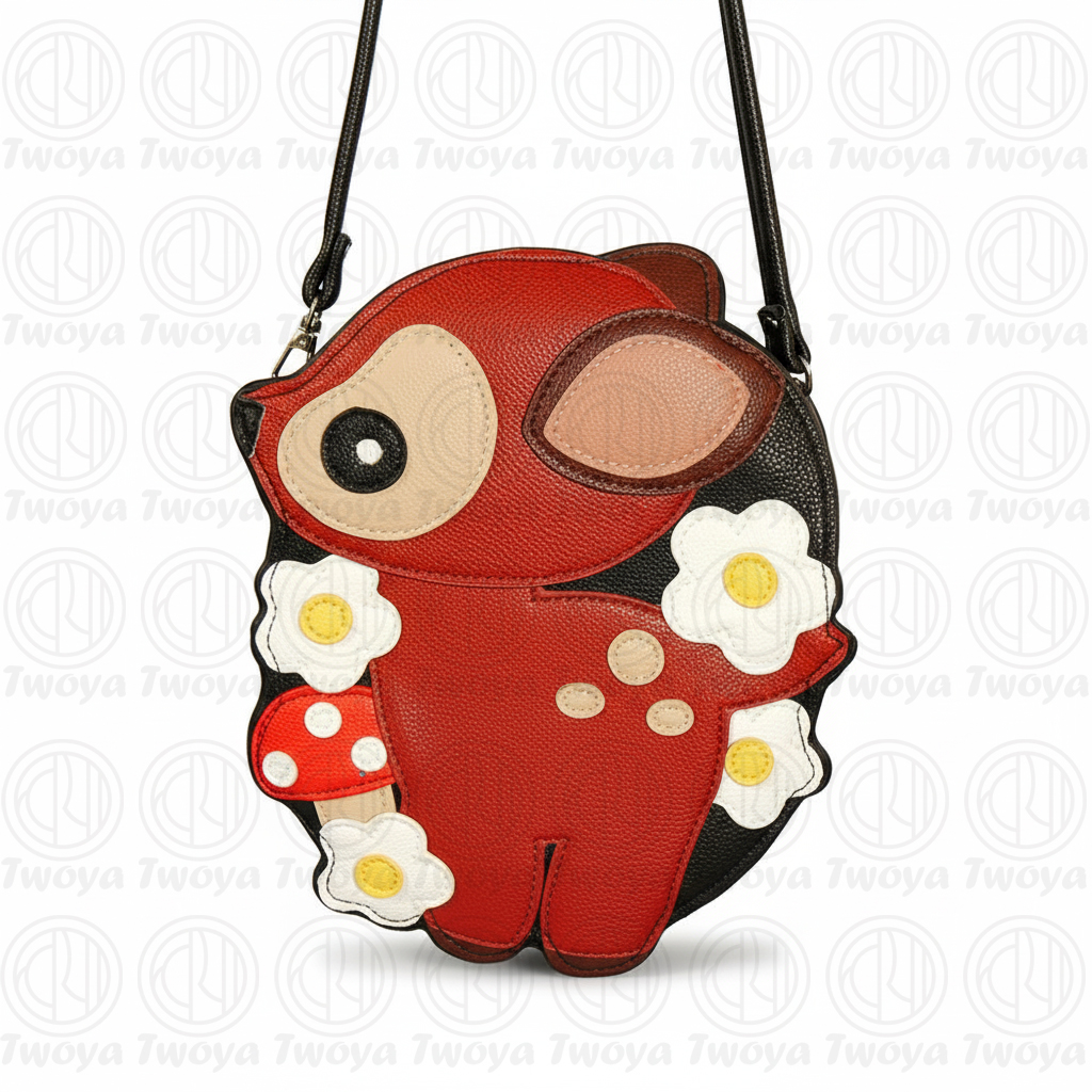 Step out in unique style with this eye-catching animal-themed bag, featuring a charming fawn design in a rich crimson red and soft tan palette. Its distinctive silhouette, adorned with playful forest appliqués, makes it a true standout, perfect for adding a touch of free-spirited elegance to any outfit.